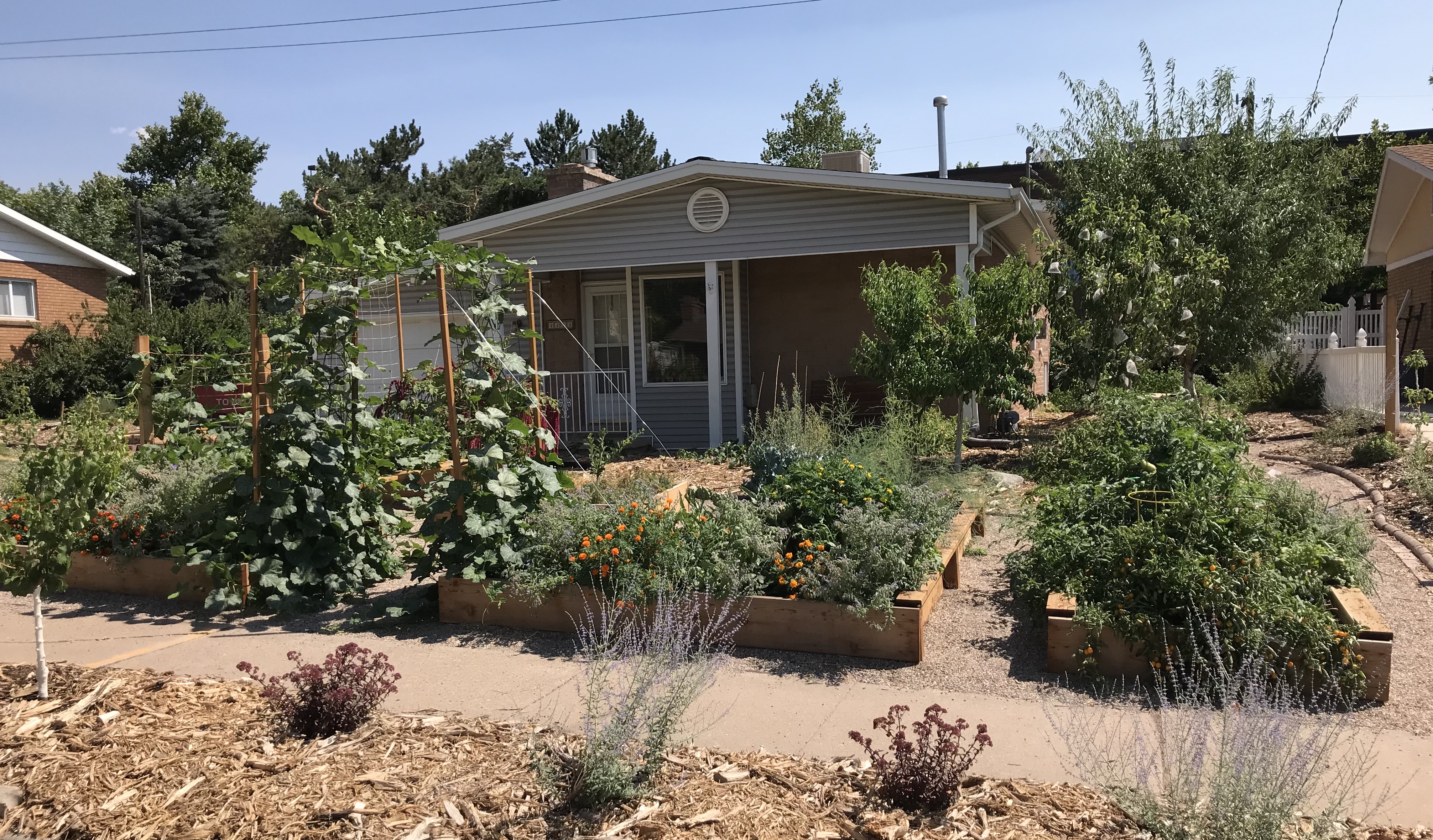 Somewhere along the line in the evolution of modern US culture, we developed the idea that a yard should be only ornamental, but that food cultivation should either be done by someone else or that it should be relegated to a corner plot of basic rows. In the US, a yard is distinct from a garden, and food cultivation happens in a massive farm between 700 and 2500 miles away. The fruits and vegetables we eat taste like they have been picked too early,… because they have been picked way too early. Meanwhile, the average American spends a considerable portion of our time manicuring our grass lawns and landscape, or we pay someone to do it, without enjoying the fruits of that labor, so to speak. In Spanish, the word jardín is often used by some to mean not only garden but yard. Why can’t our yard be our garden? Let’s invest our time and resources in landscapes that give us more than a basic yard. Let’s turn our yards into foodscapes.